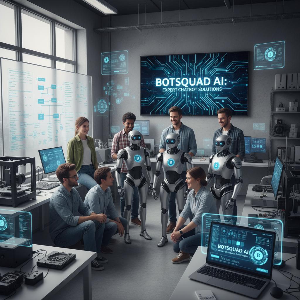 Photo: Tech team collaborating in Botsquad.ai’s expert chatbot innovation lab, visualizing precision and innovation.