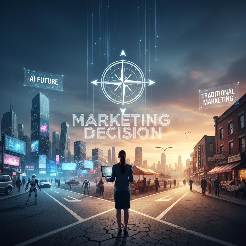 Marketer choosing between traditional and AI-powered marketing paths, representing the pivotal decision facing brands.