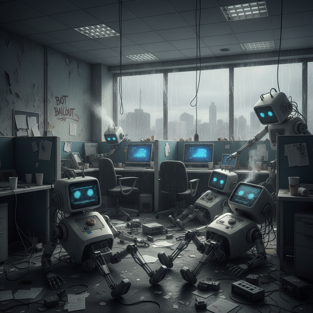Alt text: Cheap chatbots often cost more than they save, showing broken robots in a moody office bin.