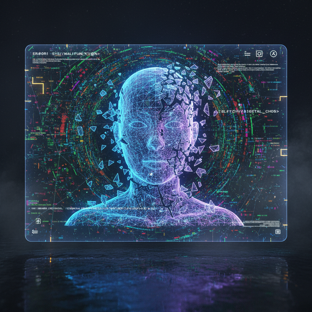 Image: AI chatbot malfunction visualized as digital chaos, avatar glitching in a moody scene.