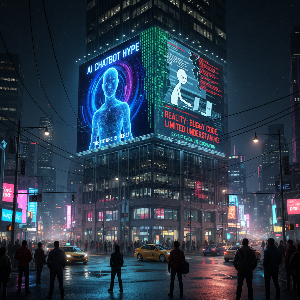 Image: AI chatbot hype meets gritty reality in 2025, billboard peeling to reveal code underneath.