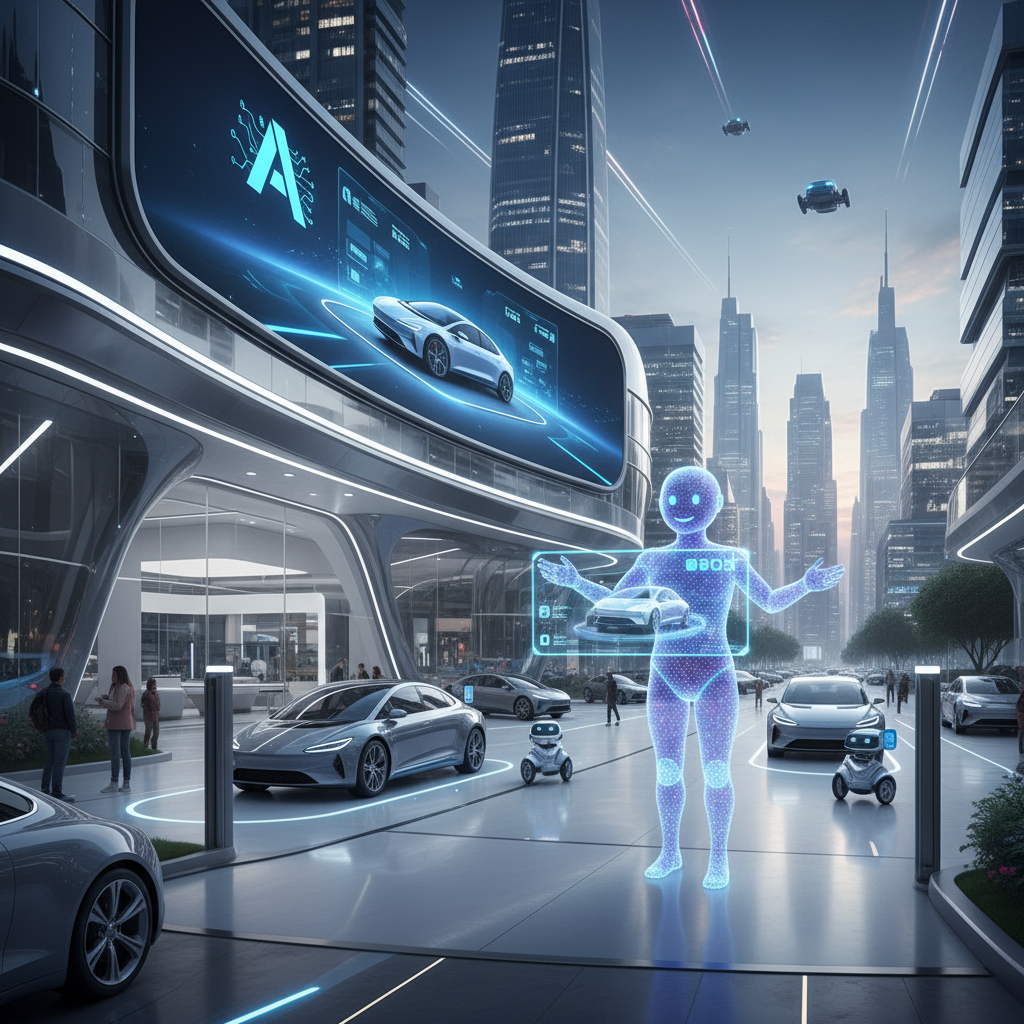 Concept art of a fully autonomous, AI-powered car dealership where bots manage every customer interaction.