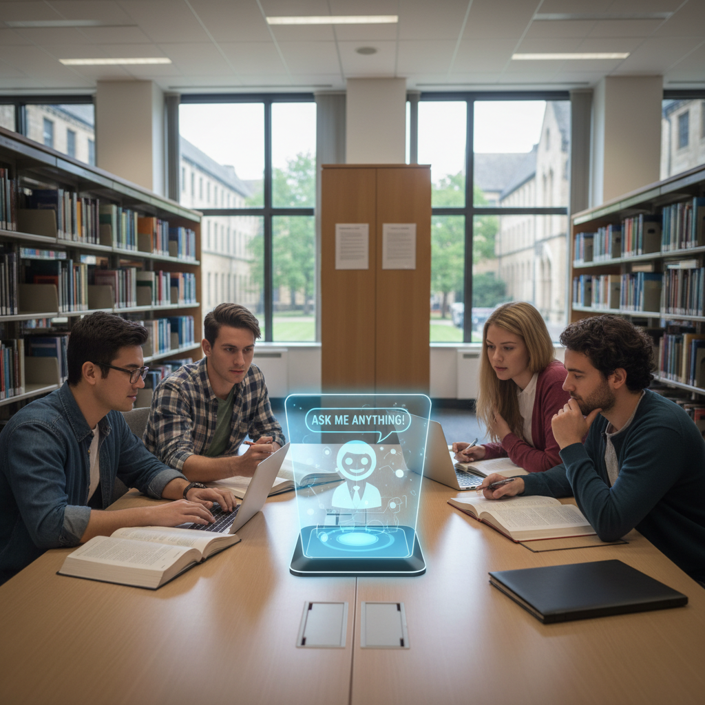 Alt: Students collaborating with an AI chatbot for higher education during a group study session in a university library