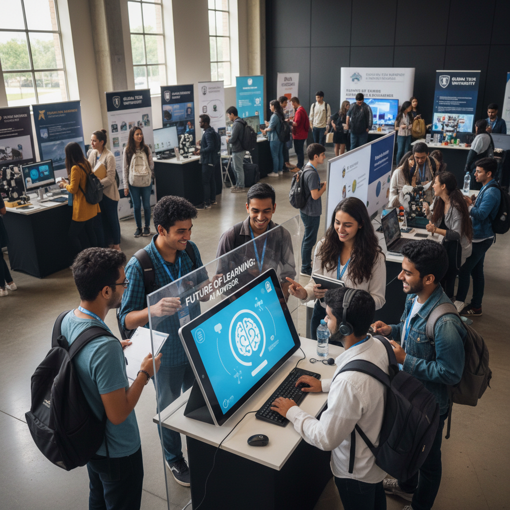 Alt: Students engaging with AI chatbots for higher education at a university tech expo, showing curiosity and skepticism