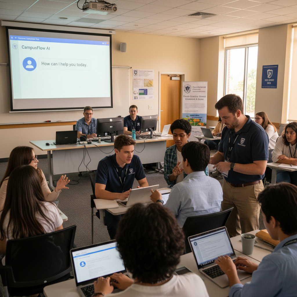 Alt: University chatbot team and students collaborating during a live feedback session, AI chatbot in higher education context