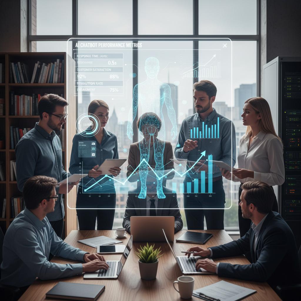Alt: Editorial team reviews chatbot performance metrics in a digital newsroom using AI tools