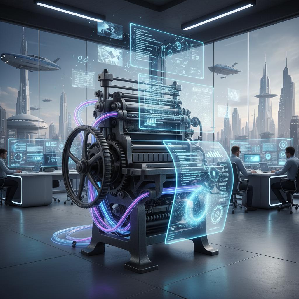 Alt: Old media printing press beside a glowing AI interface, symbolizing the contrast between traditional and future media companies