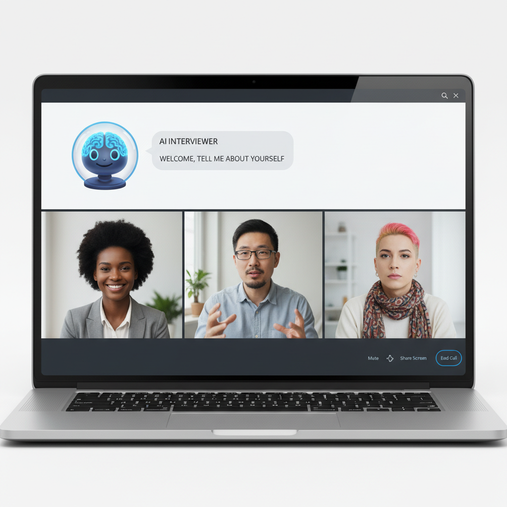 Alt text: AI chatbot conducting interviews with candidates of different backgrounds, demonstrating inclusive recruitment automation.