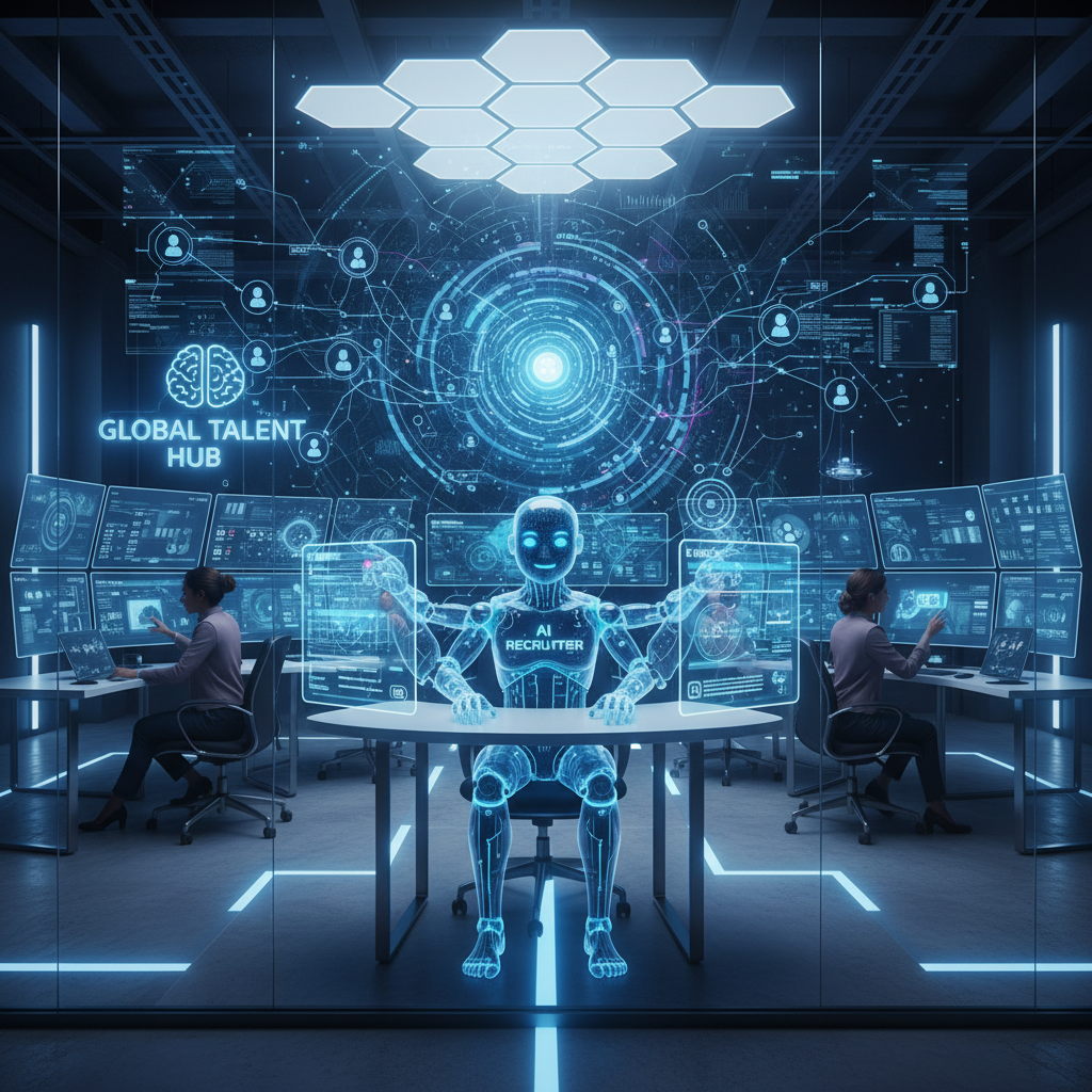 Alt text: Futuristic recruitment command center with screens showing AI chatbot data flows, illustrating the future of recruitment agencies.