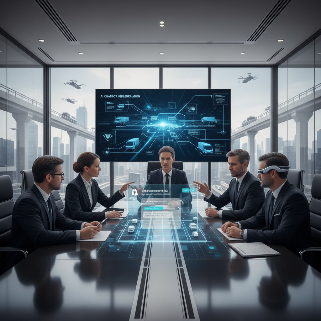 Alt: Transportation leaders in a boardroom, analyzing AI chatbot implementation plans with projected AI interfaces