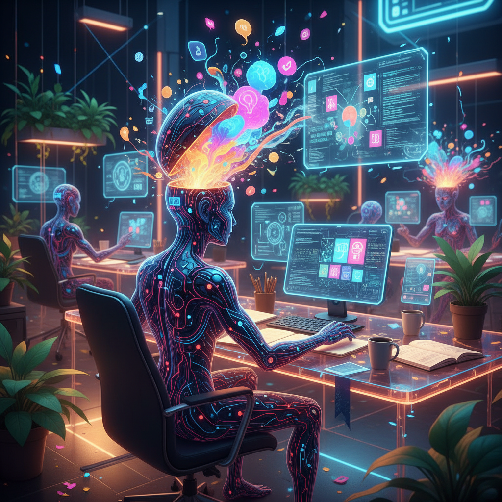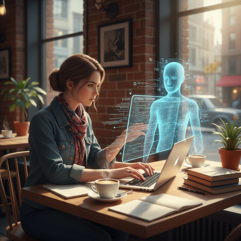 Alt text: Writer brainstorming with AI avatar in a cozy, energized office for creative inspiration and ideation.