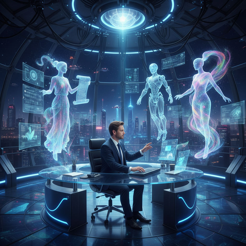 Alt text: Writer collaborating with holographic AI muses in a high-tech, awe-inspiring studio for creative writing inspiration.
