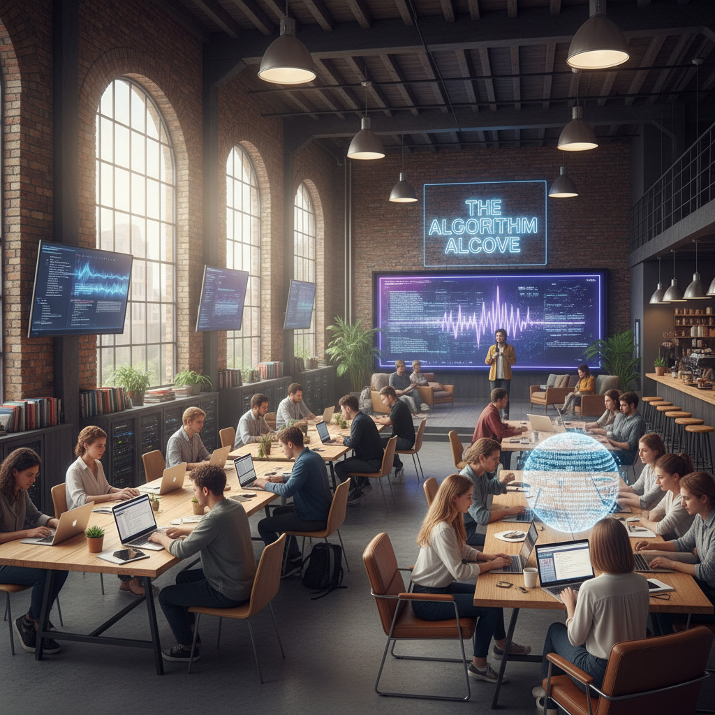 Alt text: Diverse writers collaborating in an online AI writing community, working at laptops in an urban loft for creative inspiration.