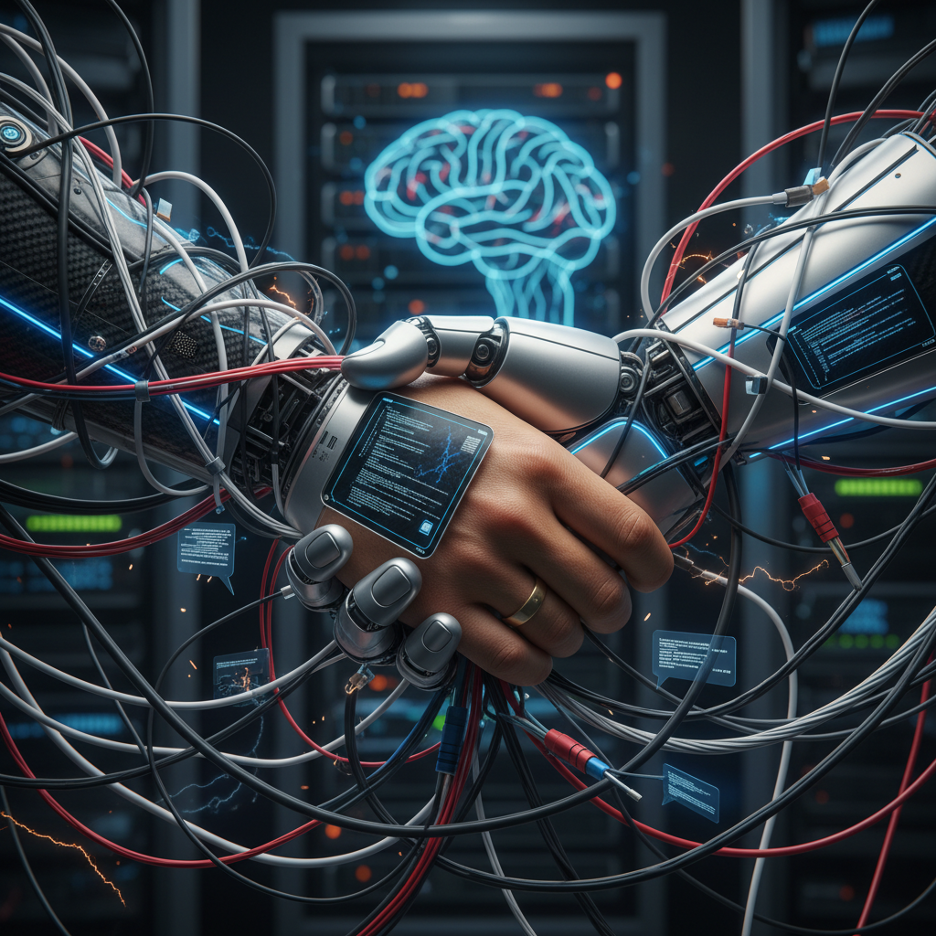 Alt text: Human and robotic hands gripping glowing tangled wires in a tech workspace, symbolizing AI chatbot integration challenges.