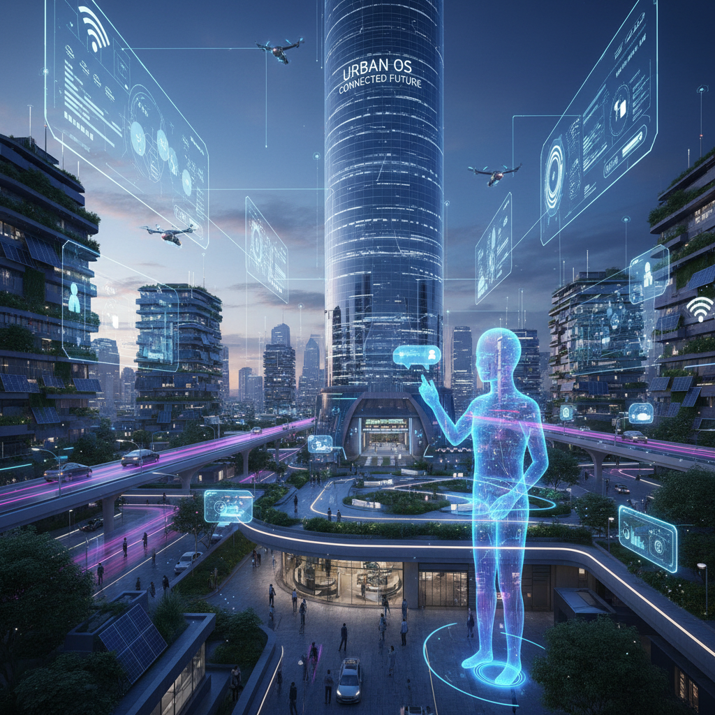 Alt text: AI chatbot interacting with IoT devices and AR interfaces in a smart city, representing advanced real-time data integration.