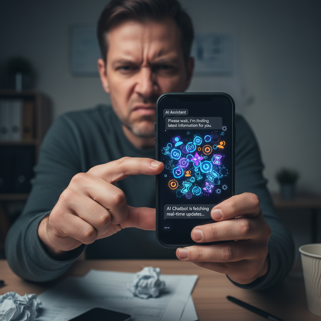 Alt text: User waiting for delayed chatbot update, with visible frustration and spinning loading icons; concept of AI chatbot real-time updates tool delay.