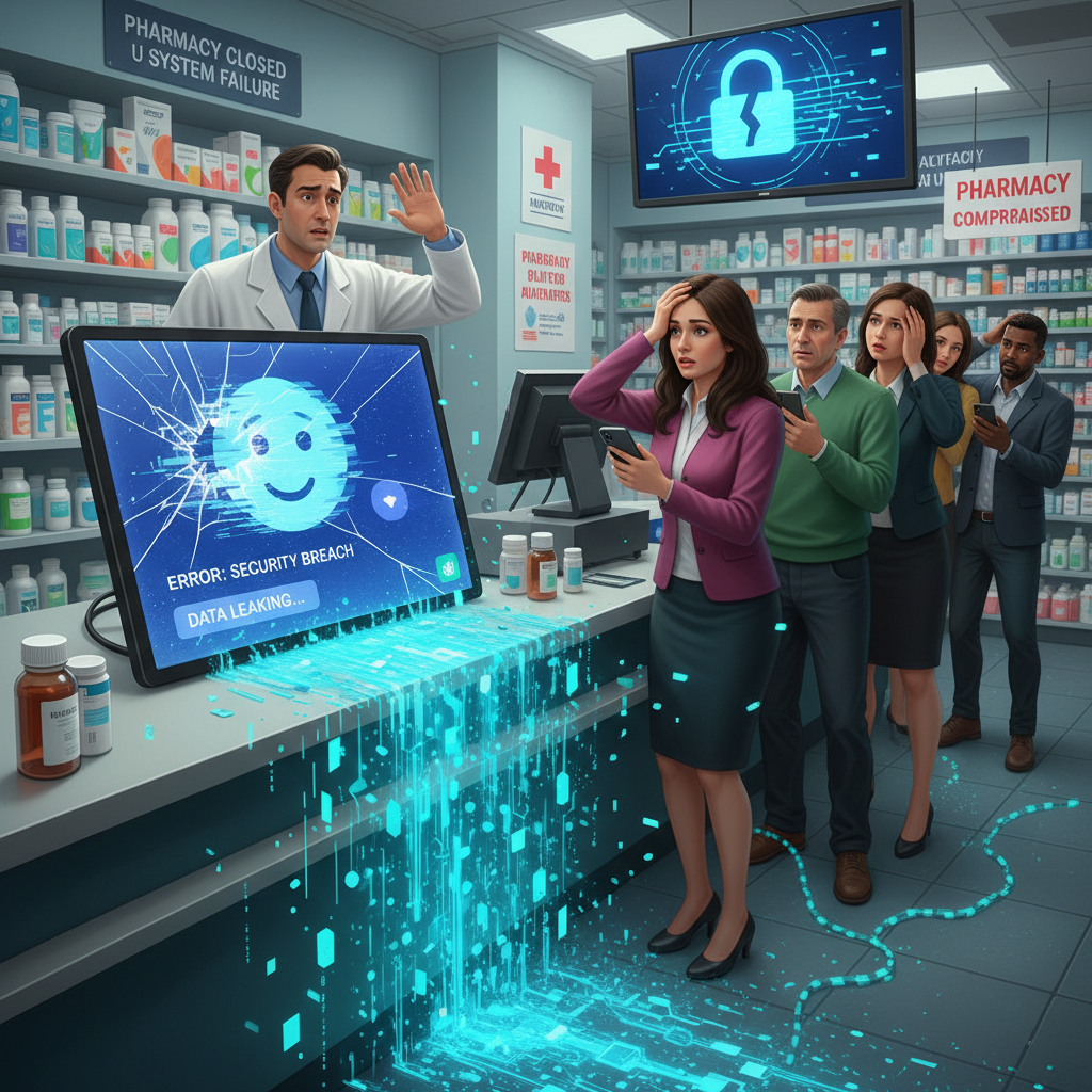 Photo: Broken chatbot screen on a pharmacy counter, symbolizing a data leak crisis in healthcare.
