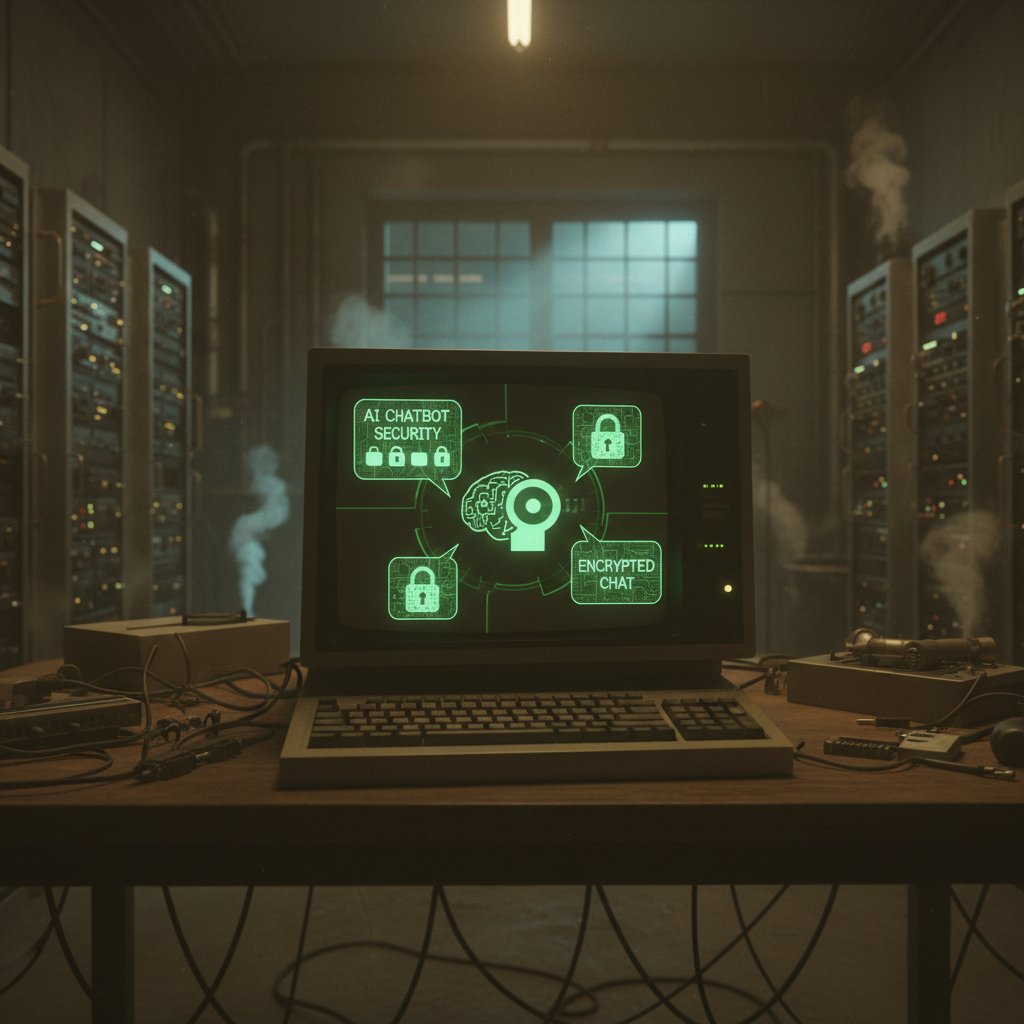 Photo: Vintage computer terminal with chat bubbles and digital padlocks, illustrating early chatbot security concepts.