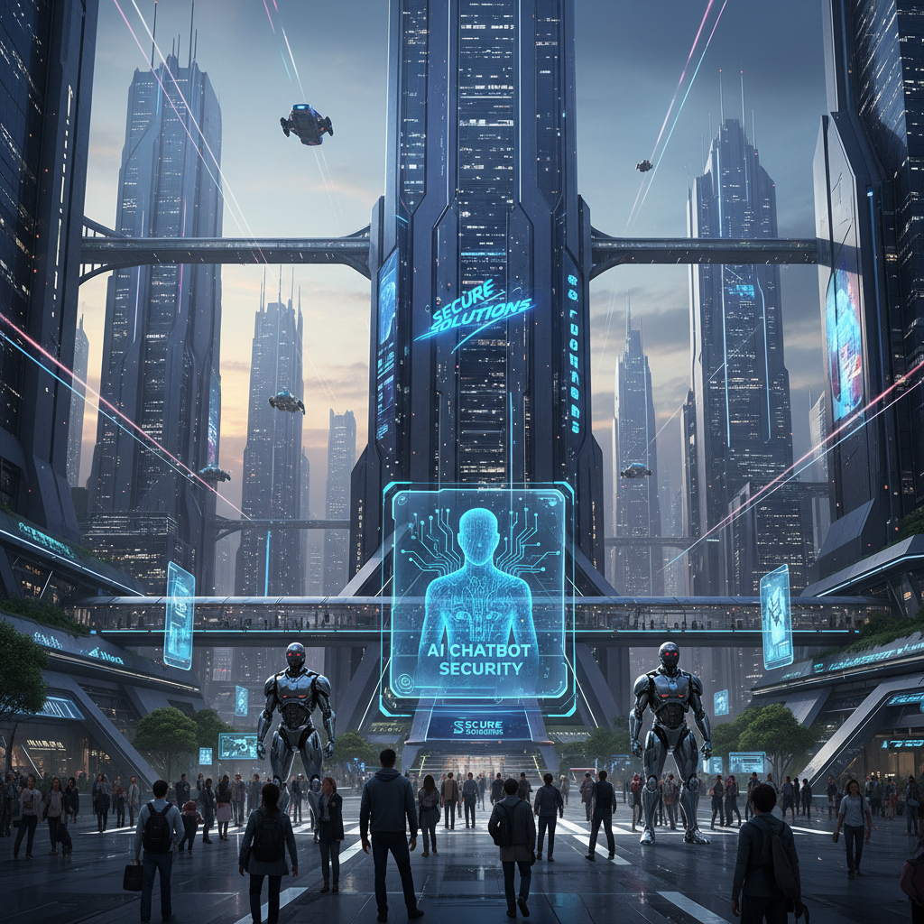 Alt: Futuristic city with glowing AI chatbots and shadowy figures, visualizing next-gen chatbot security threats