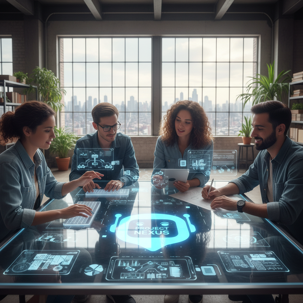 Alt text: Creative team in brainstorming session using AI chatbot interface on wall, illustrating collaboration and simplification of complex projects