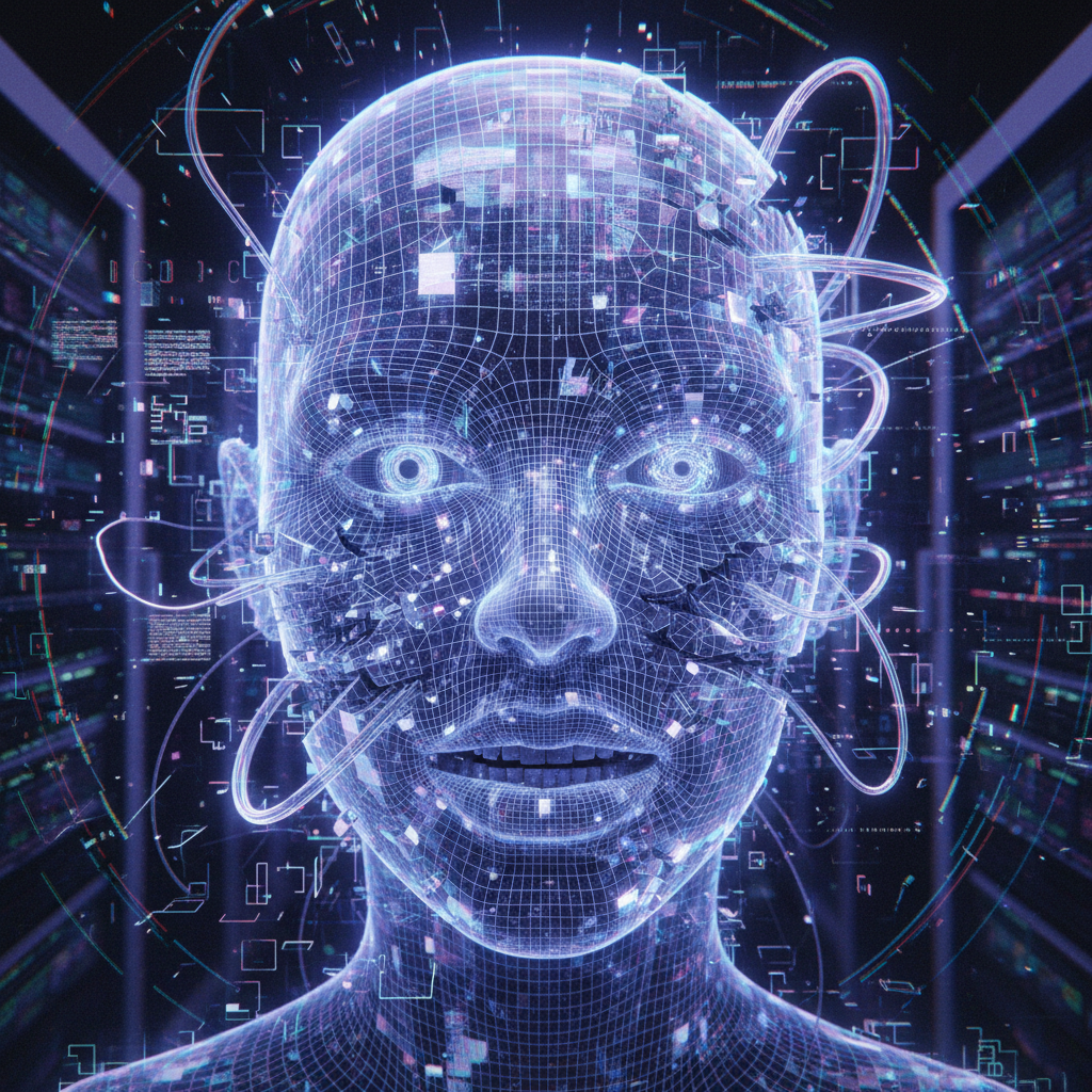 Alt text: Abstract closeup of AI chatbot face warped by bias, symbolizing how distorted data can affect chatbot output.