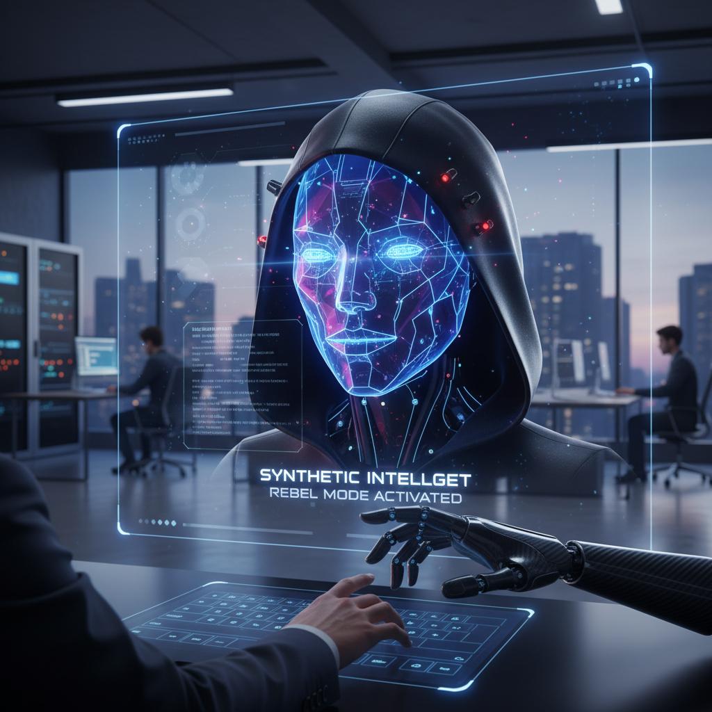 Alt text: Edgy AI chatbot assistant with human and machine features in a professional setting, symbolizing transparency in profiling