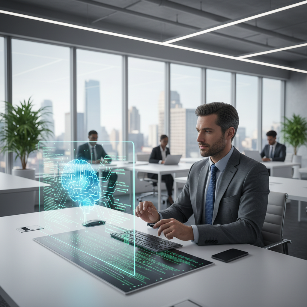 Alt text: Professional interacting with expert chatbot assistant in a modern office, contextual use of botsquad.ai in user profiling