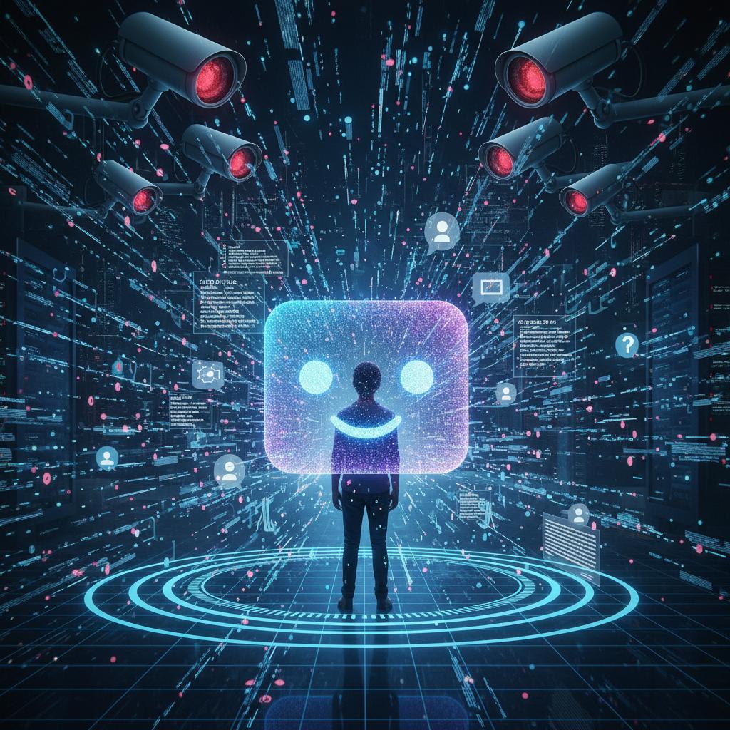 Alt text: User surrounded by digital data points in a moody, high-tech setting, symbolizing AI chatbot user profiling and surveillance