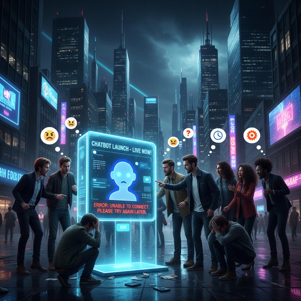 Photo of frustrated users at a chatbot launch event, illustrating the consequences of poor AI chatbot user testing in a real-world setting.