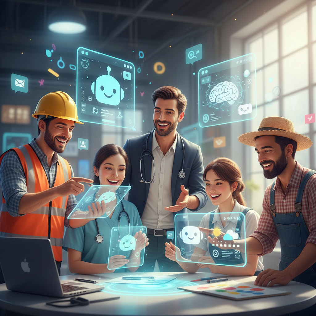 Photo montage of professionals in various industries engaging with AI chatbots, symbolizing cross-industry innovation in chatbot user testing.