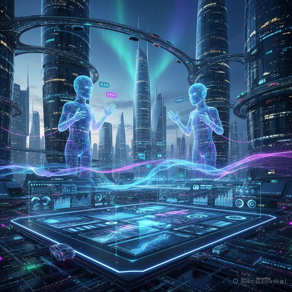 Descriptive alt text: Futuristic city with chatbots and data waves showing AI analytics evolution