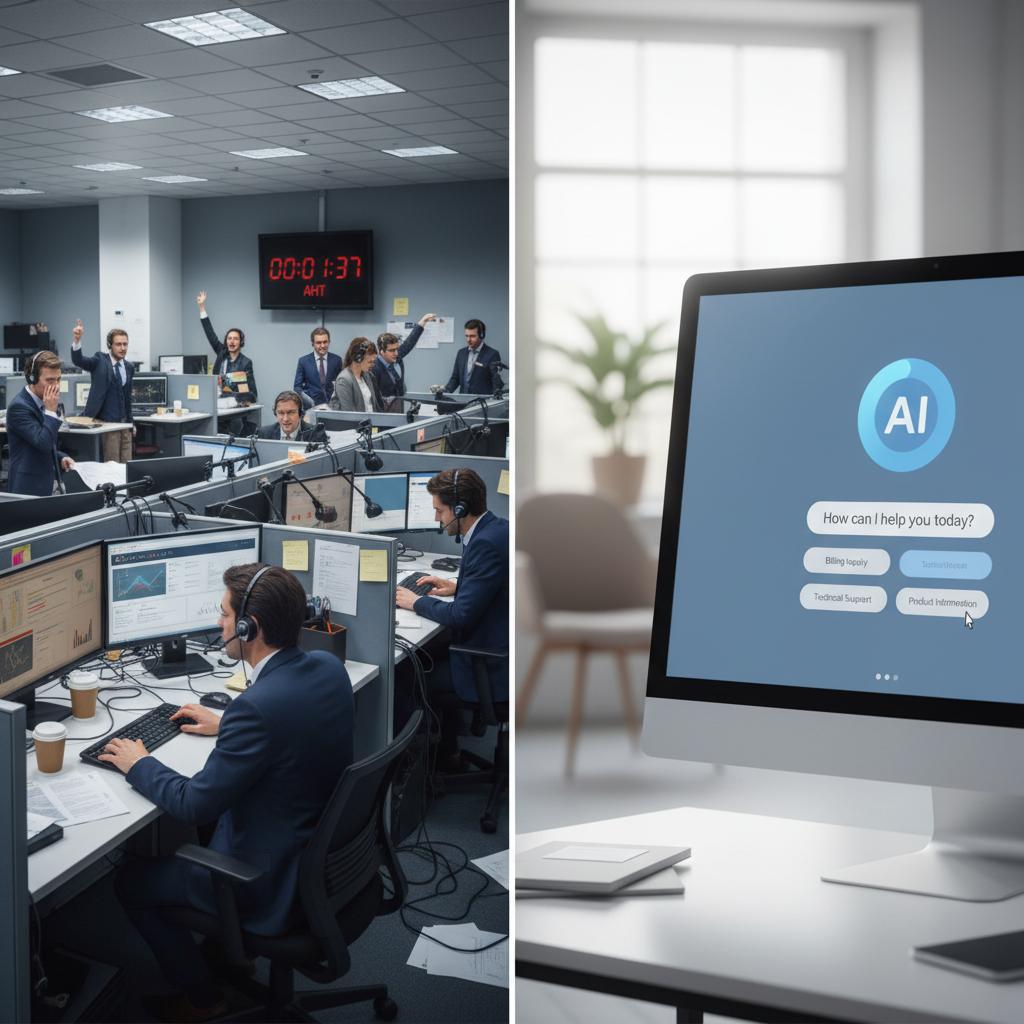 An overstressed call center versus the calm efficiency of AI-powered chatbot call deflection