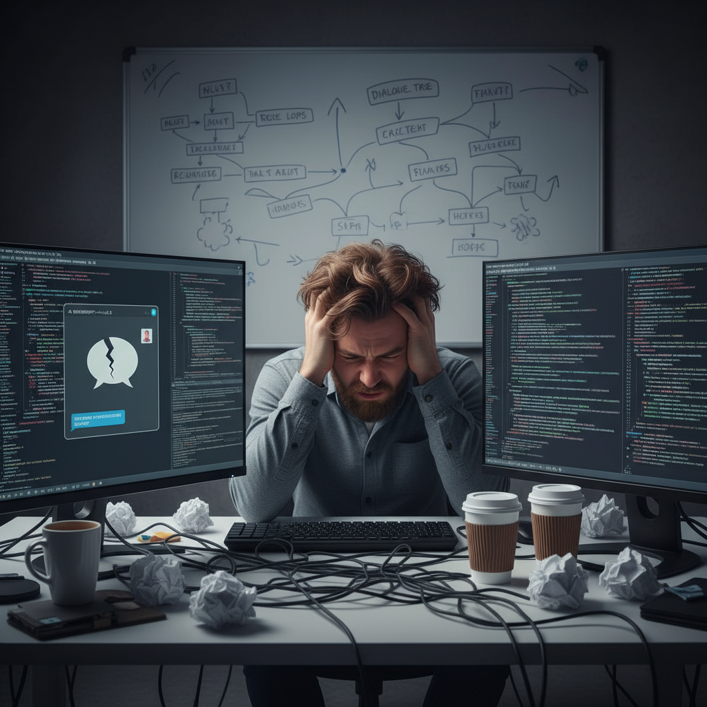 Descriptive alt text: AI chatbot developer frustrated at computer with complex chatbot conversation scripting on screen