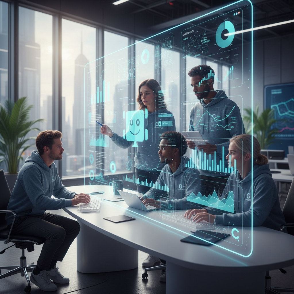 Image: Developer team analyzing chatbot customer query resolution analytics on multiple screens in a tech office, symbolizing continuous improvement.