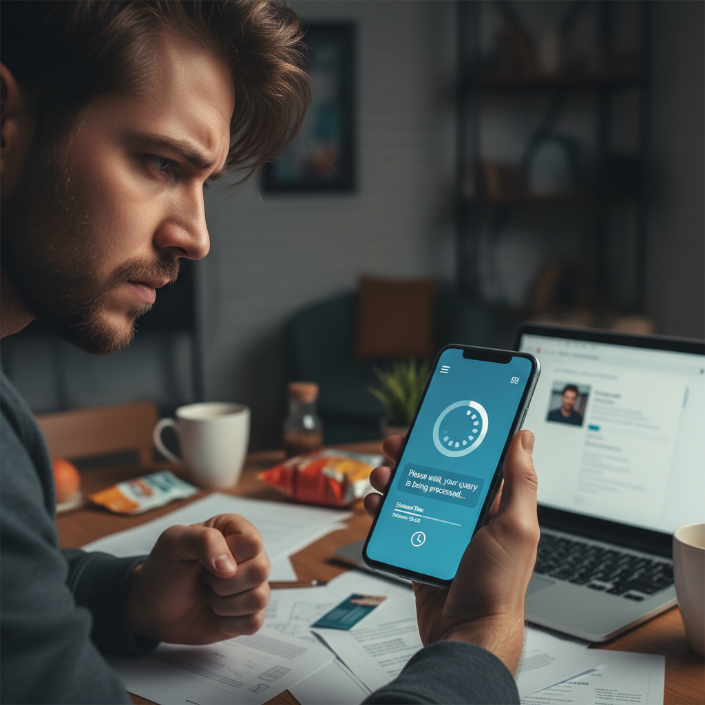 Image: Frustrated customer experiencing slow chatbot response in a dimly lit urban apartment, highlighting the need for instant query resolution.
