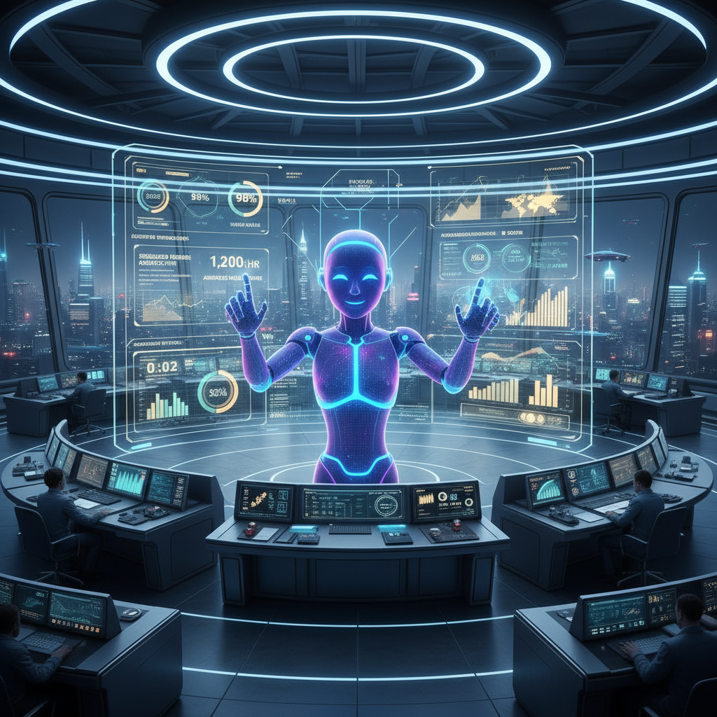 An AI chatbot avatar scrutinizing real-time customer service metrics, reflecting the high-stakes, investigative nature of chatbot analytics.