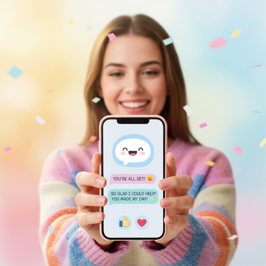 Alt text: Satisfied customer using a chatbot on mobile device, uplifting mood, customer support evaluation