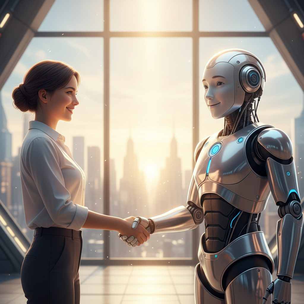 Alt text: Human and chatbot shaking hands, symbolizing mutual respect in customer support evaluation