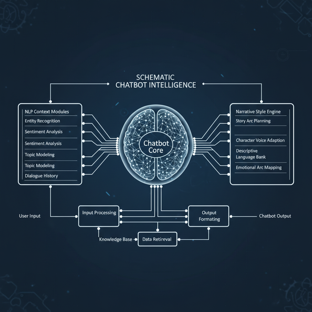 Alt text: Schematic photo showing a conceptual chatbot brain with NLP and context modules for customer support evaluation