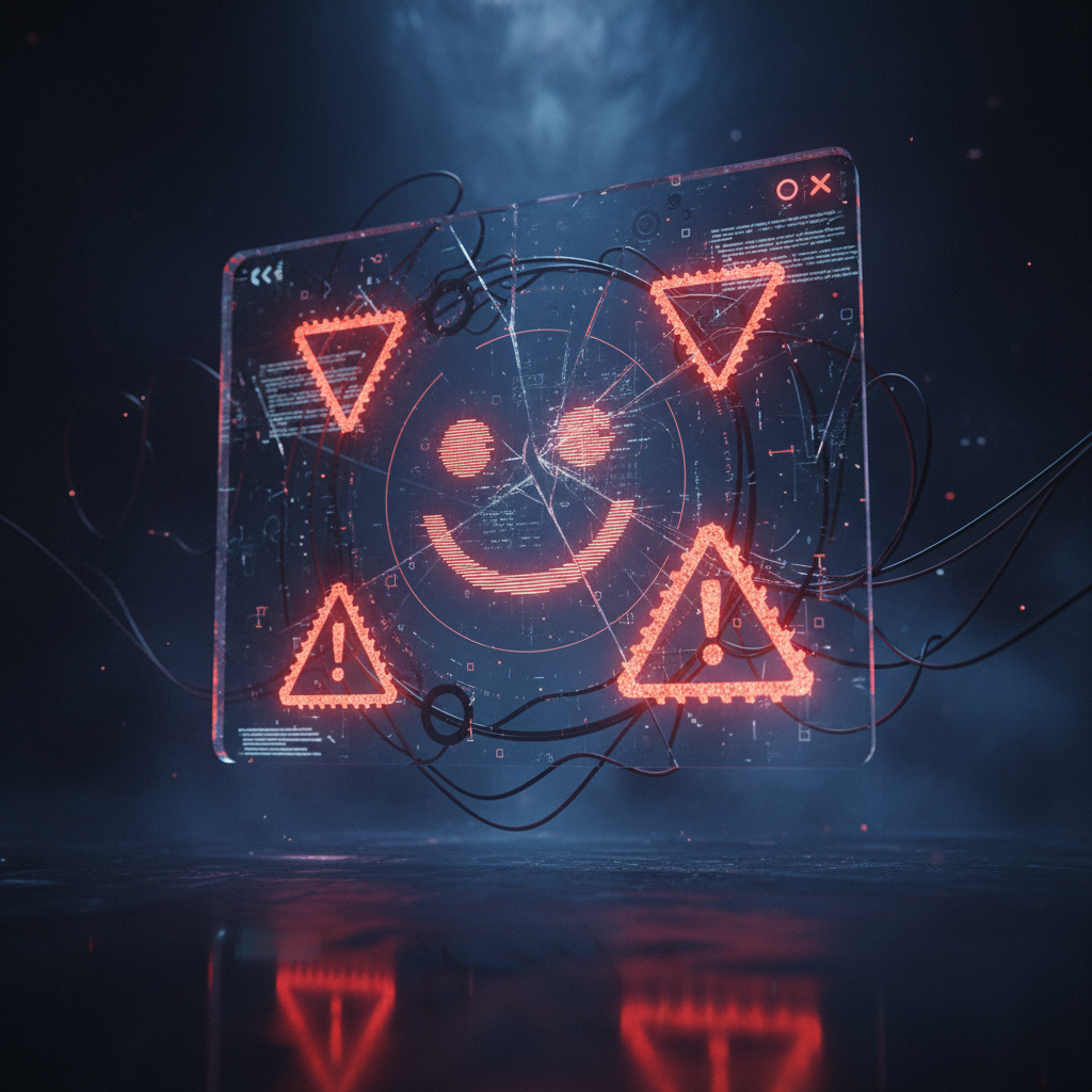 Alt text: Chatbot interface with smiley face and warning sign overlays, symbolizing dangers of shallow evaluation metrics