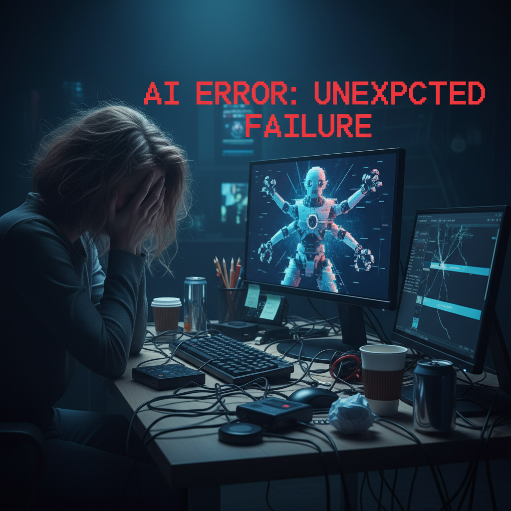 Alt text: Frustrated content creator reviewing AI-generated errors in a creative workspace, highlighting chatbot for content creation limitations