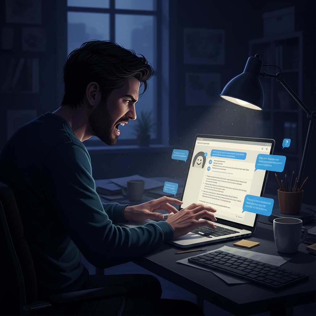 Alt text: Frustrated user struggling with chatbot journey mapping failure in dark tech office.