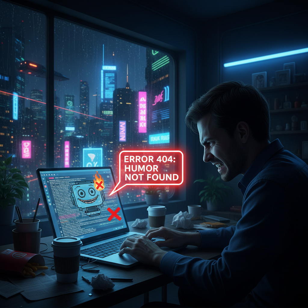 Frustrated user encountering bad chatbot response with city lights at night.