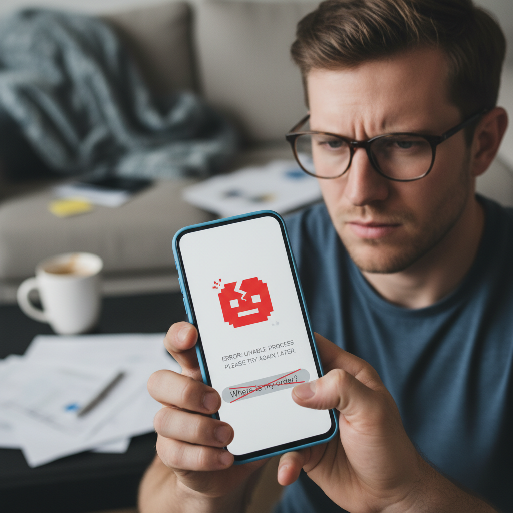 Alt text: "Customer dealing with chatbot error during online purchase, highlighting sales automation risks."