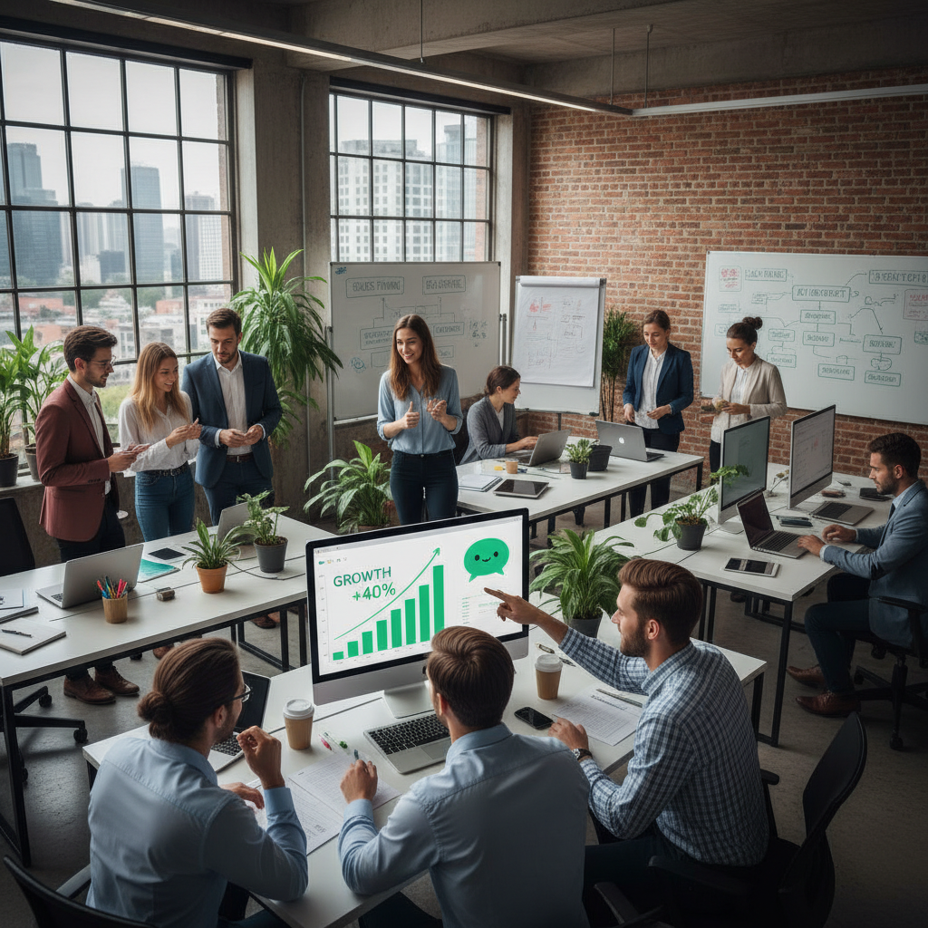 Alt text: "Startup sales team leveraging chatbots for growth, analyzing chatbot sales analytics on screen."