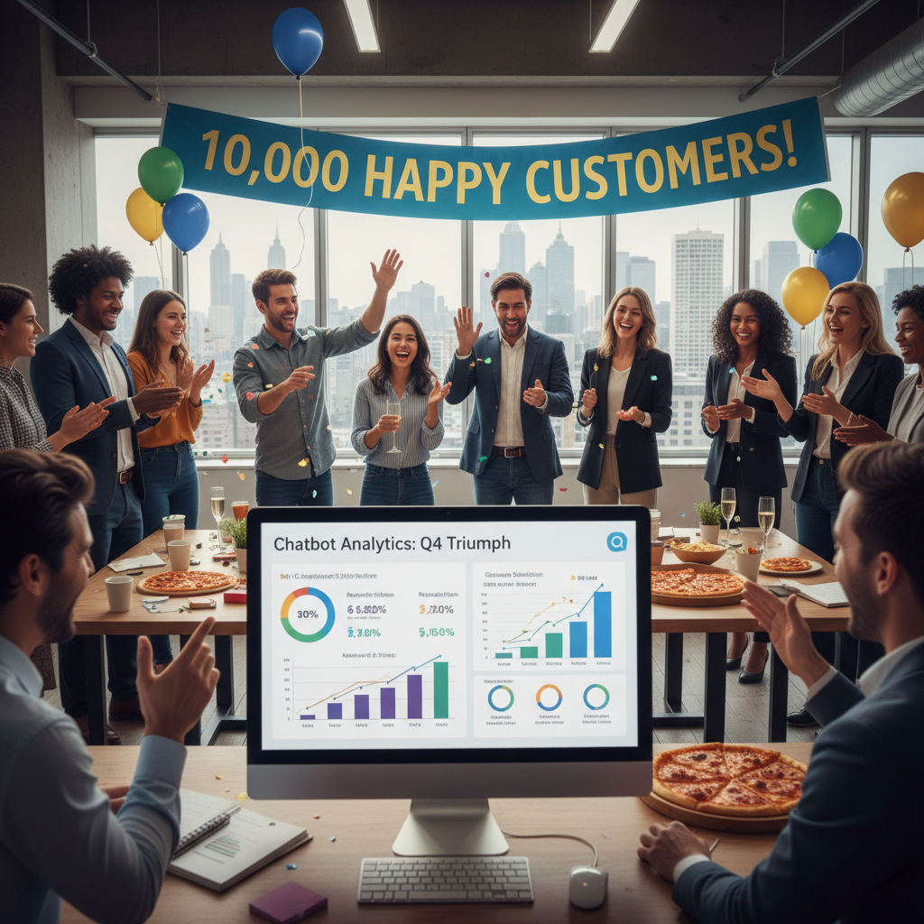 Alt: Support team celebrating after chatbot analytics dashboard shows performance improvements, highlighting real-world impact of conversational AI analytics.