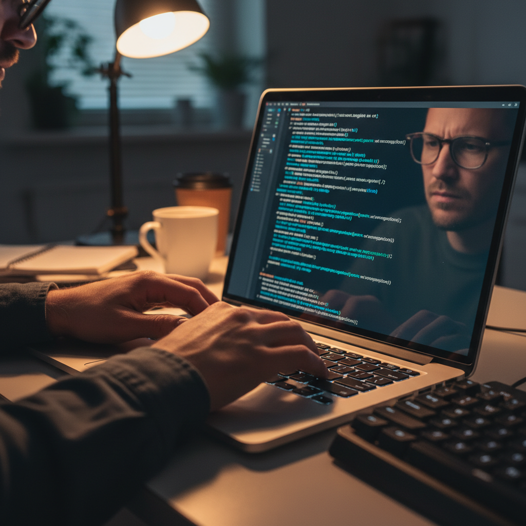 Alt text: User experimenting with conversational AI technology, hands typing chatbot code on a laptop, focused and professional mood.