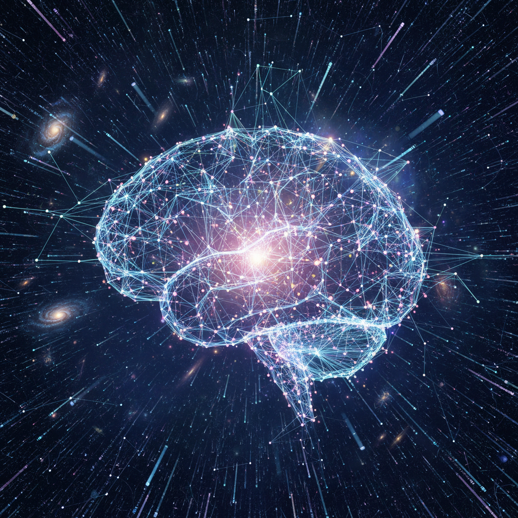 Alt text: Visualization of natural language processing in action with data flowing between a human brain and a digital network.