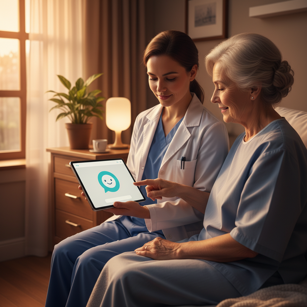 Alt text: Healthcare worker using conversational AI with a patient, supportive mood in a warm-lit room.