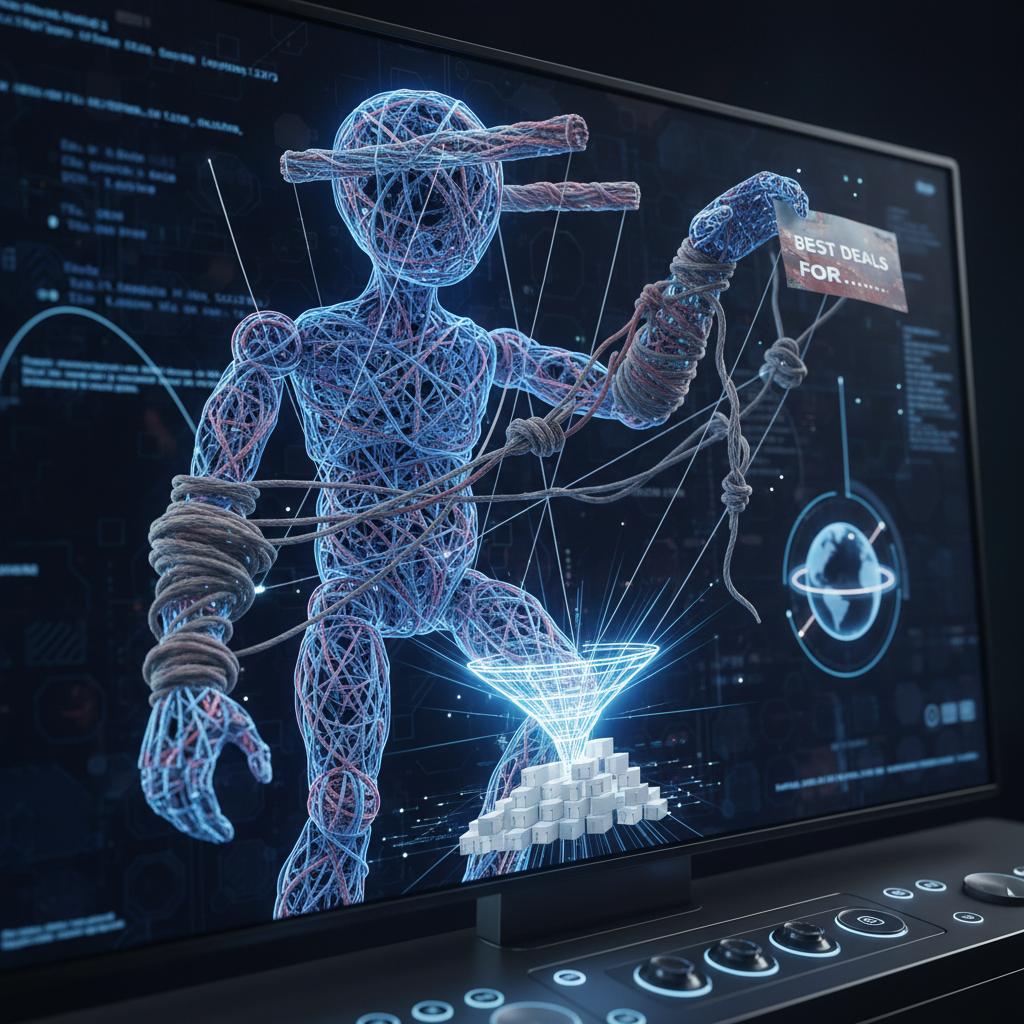 Visual metaphor: chatbot puppet tangled in algorithmic bias.